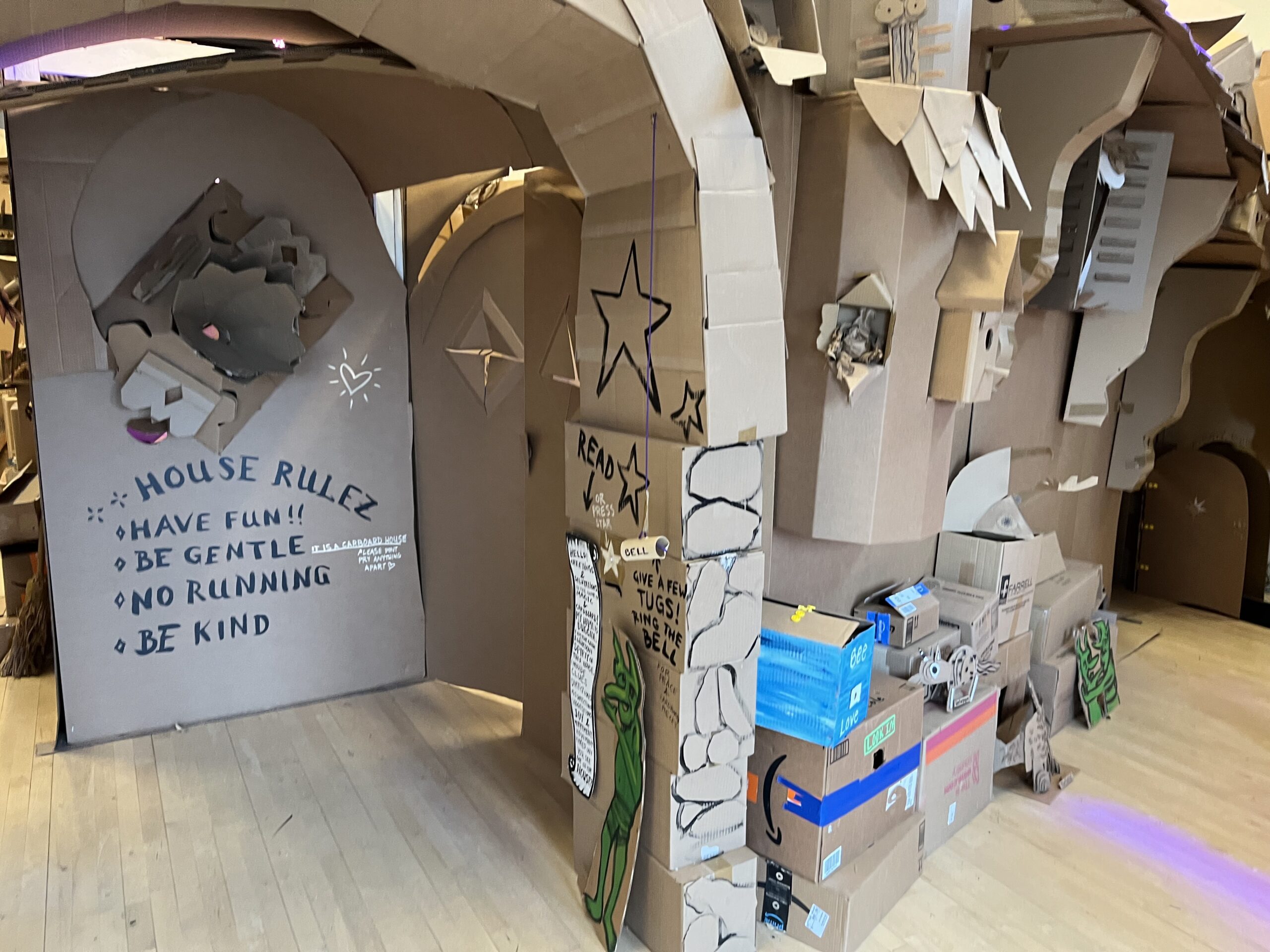 While visiting friends in Vermont, they took us to a local art center, The Highland Center for the Arts. In addition to interesting paintings by local artists, we found an amazing “play” exhibit. The Center had turned a room the size of two classrooms into a build-it-yourself playroom for local school groups. In less than a month, visiting classes had created, out of cardboard boxes, countless ways to play. Their imaginations had resulted in a complex set of tunnels through which little balls traveled. There were several pinball games with flippers that worked and bumpers to move your ball through. My friend and I, both enthusiastic pinballers, thrilled at how real this student-made game was. It had everything except the clanging of the bells when you hit a bumper!